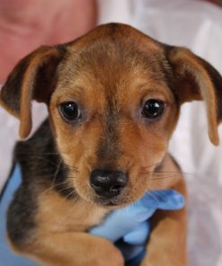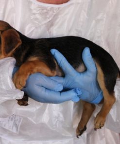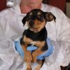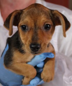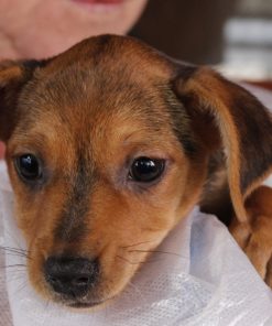 Flaminia ist die zurückhaltendste der drei kleinen Pinscherwelpen. Während ihre Geschwister sich neugierig umschauten, sucht sie lieber die Nähe vertrauter Menschen. Als wir sie auf dem Arm nahmen, hat sich Flaminia mit ihren Vorderpfoten ganz festgeklammert, als wollte sie sagen: „Bitte lass mich nicht los.“
