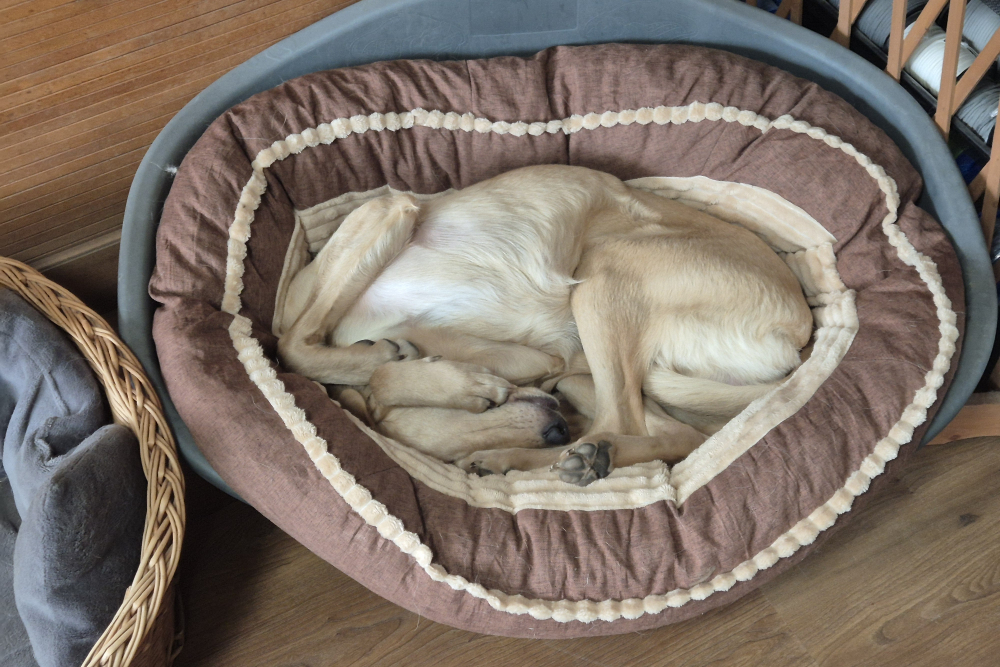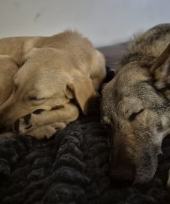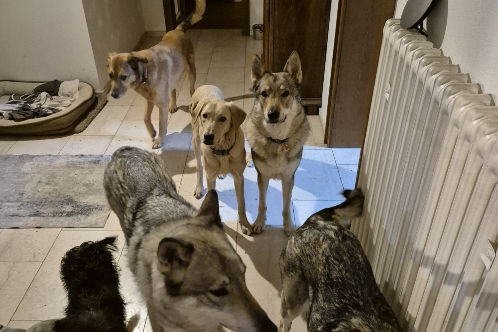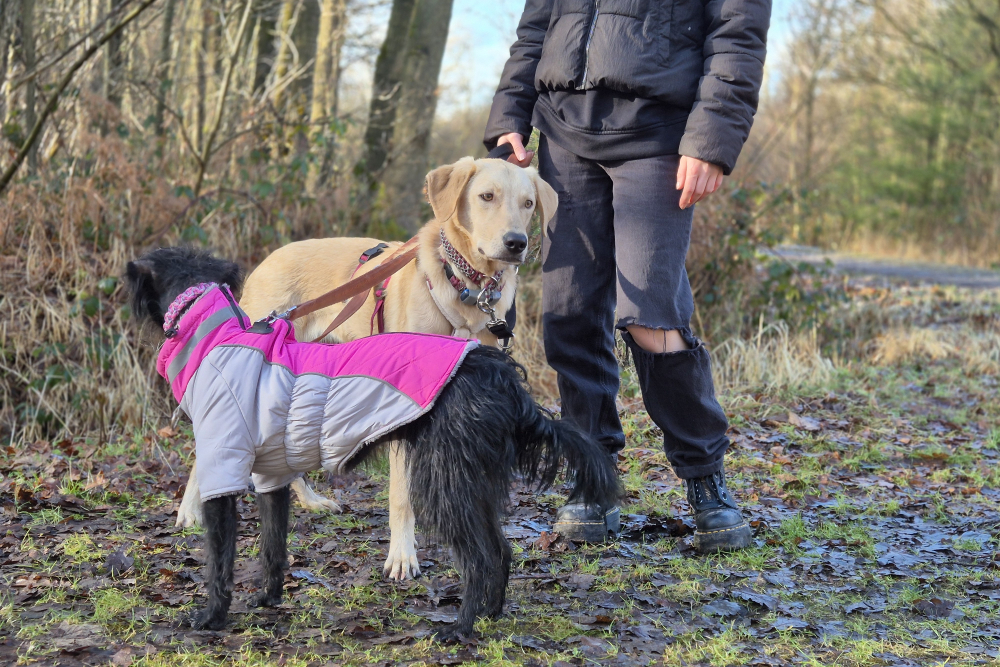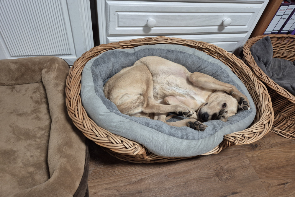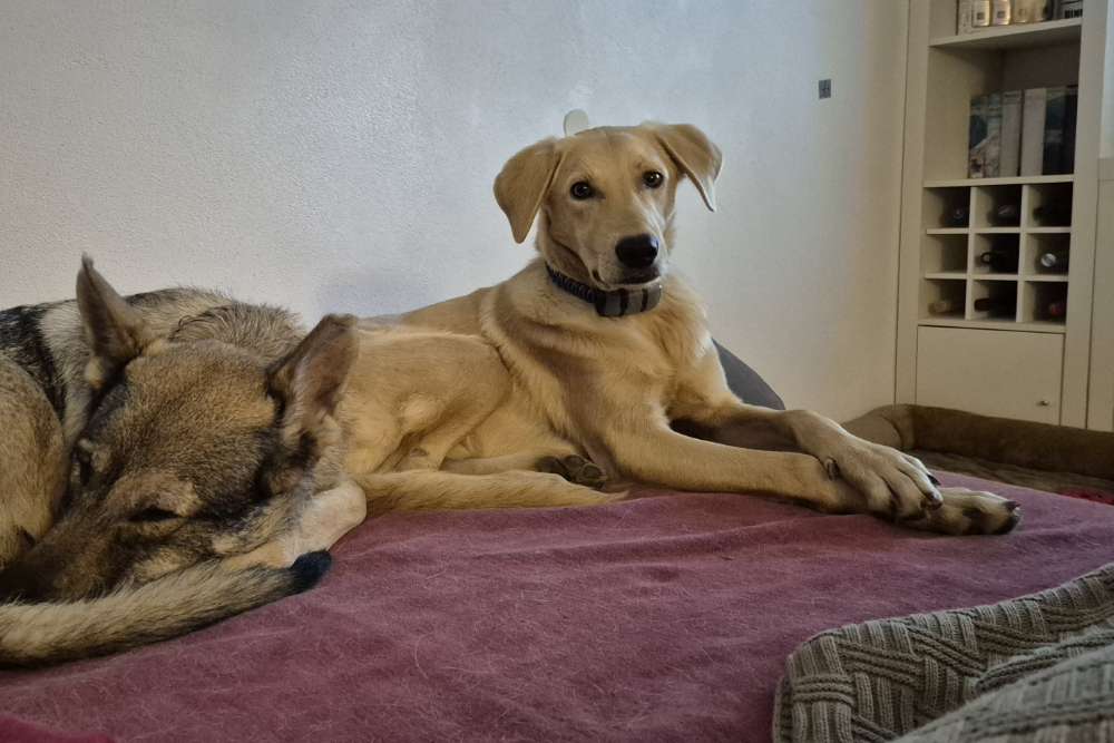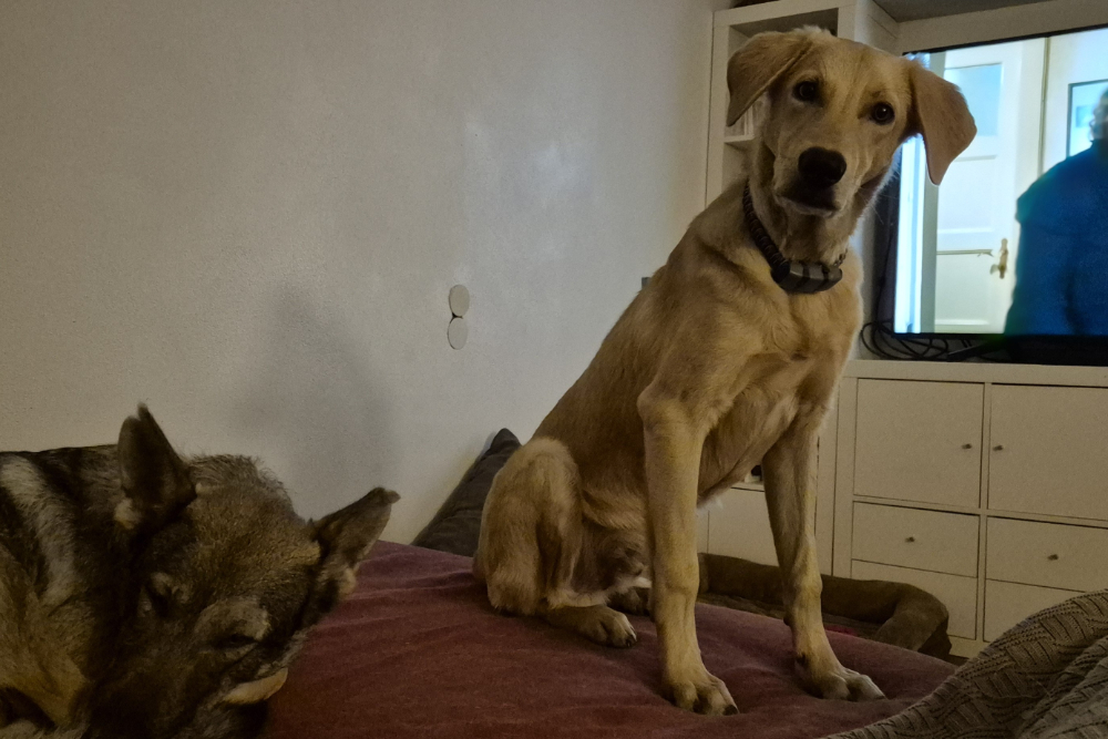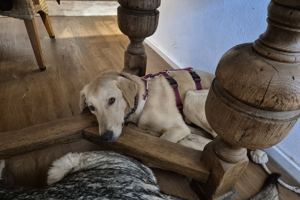 In der Nacht vom 22. auf den 23. November kam Lino schließlich in seiner Pflegestelle in Deutschland auf unserem Projekt DogsFit4Future an. Nach einem kurzen Löserunden-Stopp verkroch er sich sofort in sein Körbchen – und blieb dort bis zum Morgen völlig regungslos. Haus, Treppen, Menschen: Alles war überwältigend und beängstigend für ihn. Zum Glück hatte er auf der Reise Luna kennengelernt, eine ebenfalls unsichere, aber souveränere Hündin, die ihm ungewollt als Orientierung diente – auch wenn sie selbst vom aufdringlichen Junghund nicht immer begeistert war.