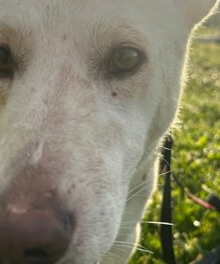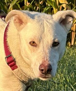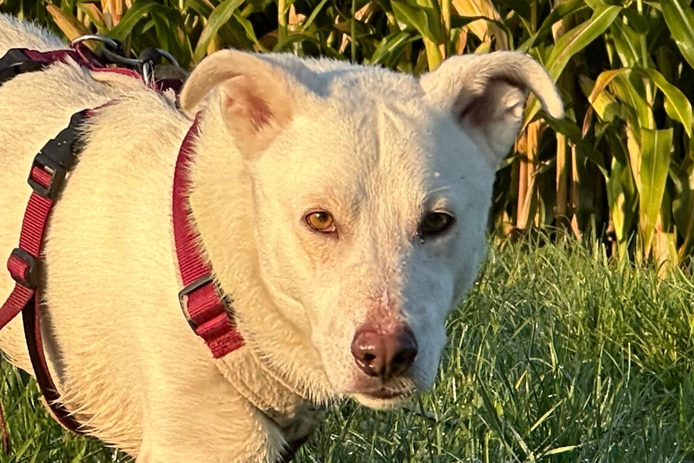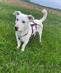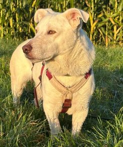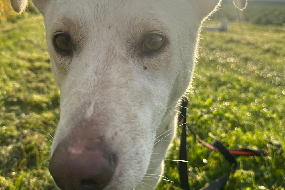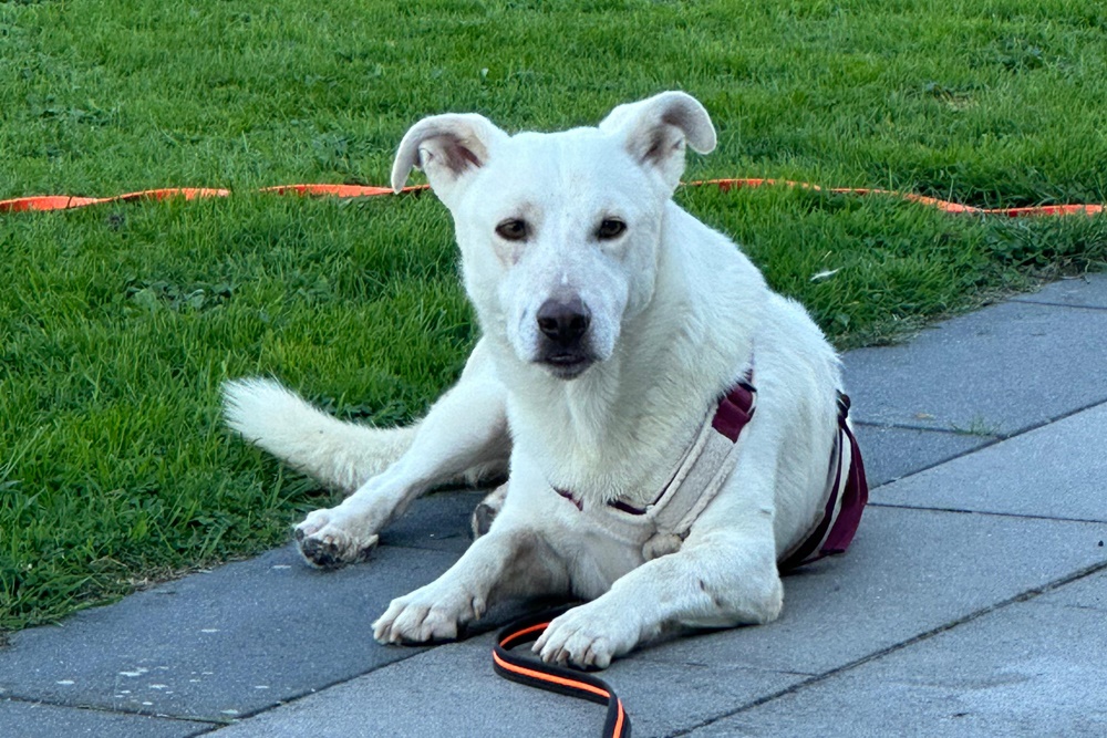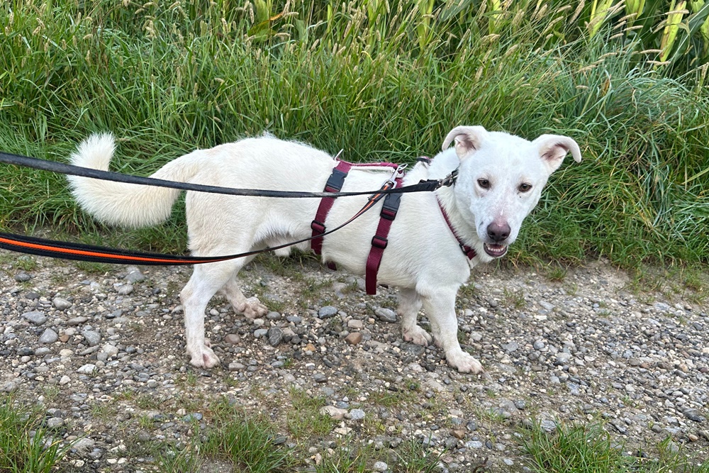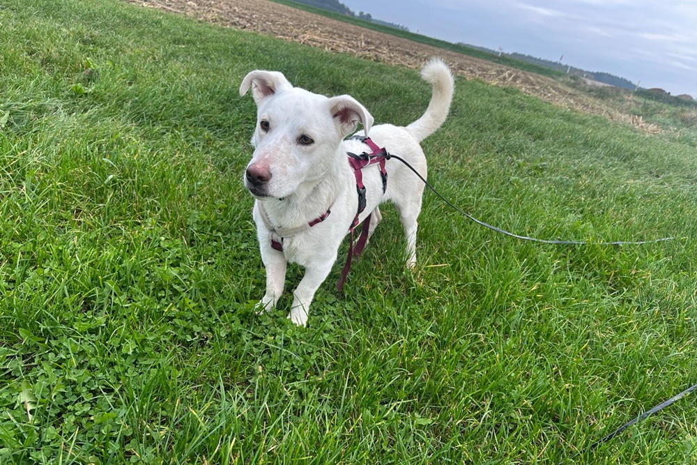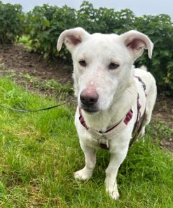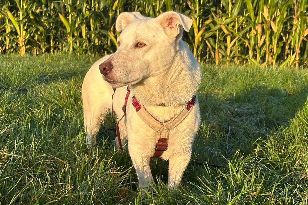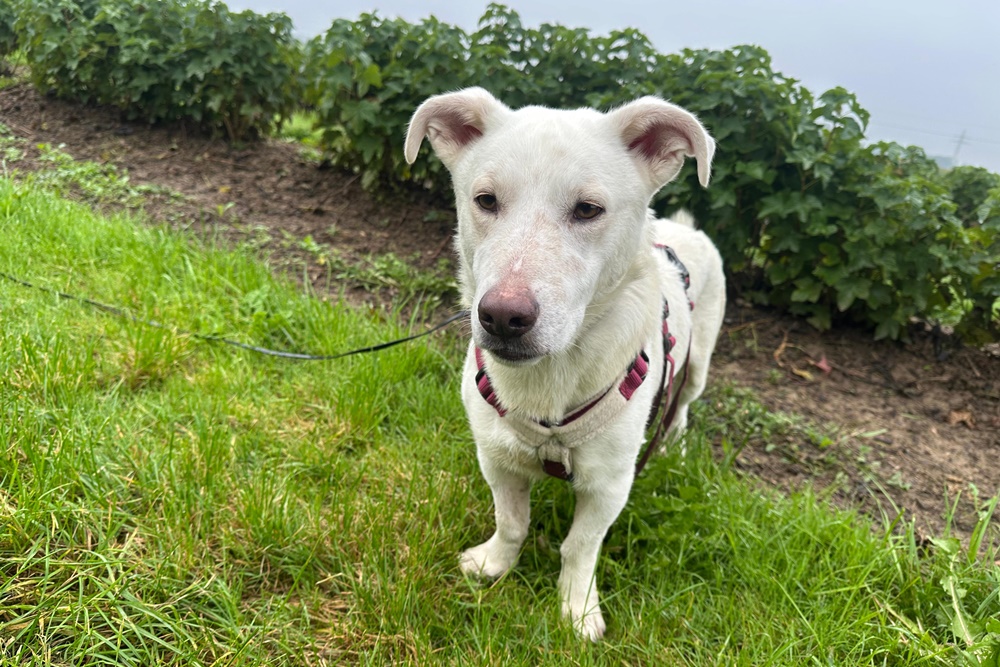 Maran ist ein zauberhafter kleiner Geselle mit einem weißen, kurzhaarigen Fell und hellbraunen Flecken am Schwanzansatz. Er hat einen langen Rücken und eine schlanke Statur – ein großer Hund auf zu kurzen Beinen. Seine Knickohren verleihen ihm einen liebenswürdigen Ausdruck, der von den hellbraunen Augen noch verstärkt wird. Welche Rassen in Maran stecken, können wir nur raten. Wir vermuten, es könnte ein weißer Schäferhund in ihm stecken und sicherlich auch kurzbeinige Rassen wie ein Terrier oder Dackel.
