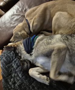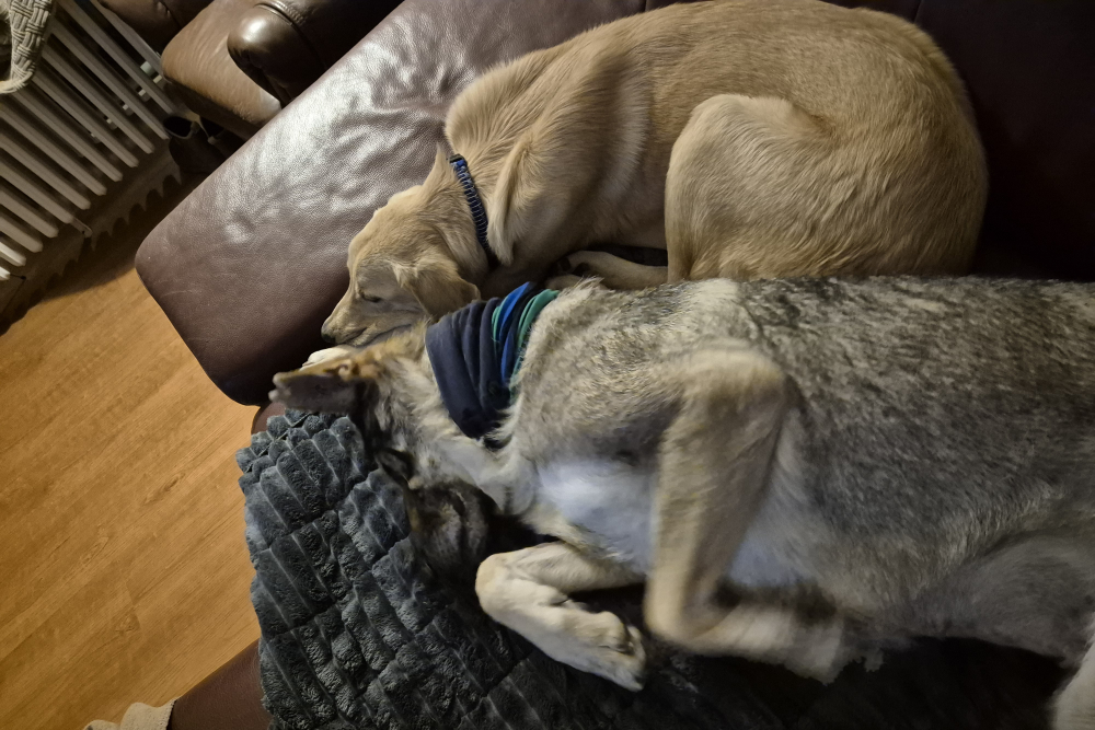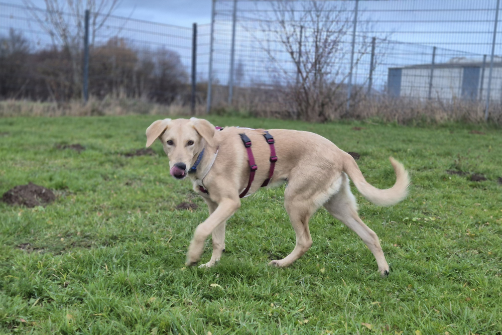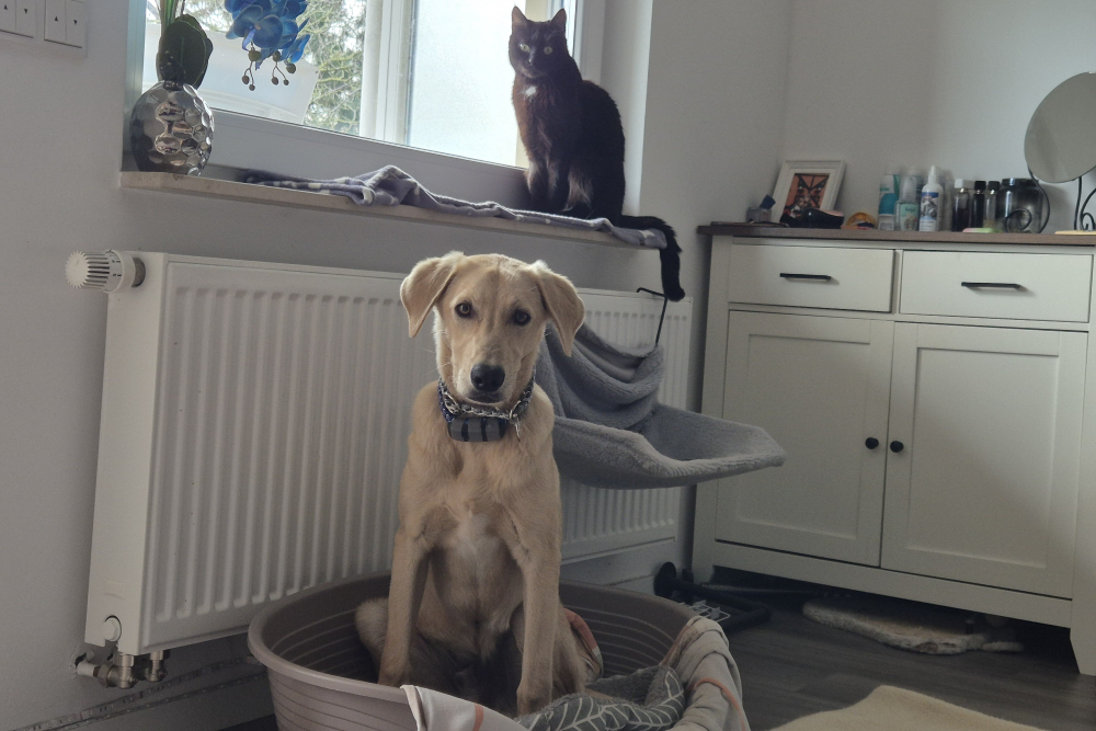 In der Nacht vom 22. auf den 23. November kam Lino schließlich in seiner Pflegestelle in Deutschland auf unserem Projekt DogsFit4Future an. Nach einem kurzen Löserunden-Stopp verkroch er sich sofort in sein Körbchen – und blieb dort bis zum Morgen völlig regungslos. Haus, Treppen, Menschen: Alles war überwältigend und beängstigend für ihn. Zum Glück hatte er auf der Reise Luna kennengelernt, eine ebenfalls unsichere, aber souveränere Hündin, die ihm ungewollt als Orientierung diente – auch wenn sie selbst vom aufdringlichen Junghund nicht immer begeistert war.