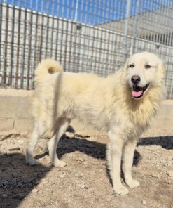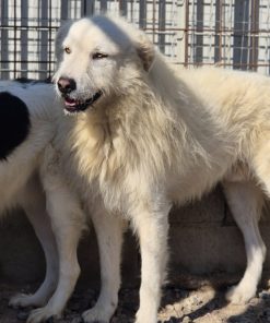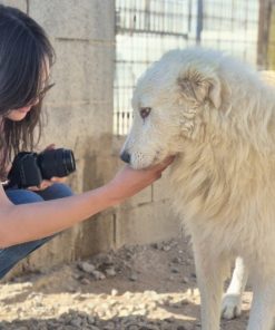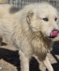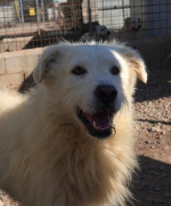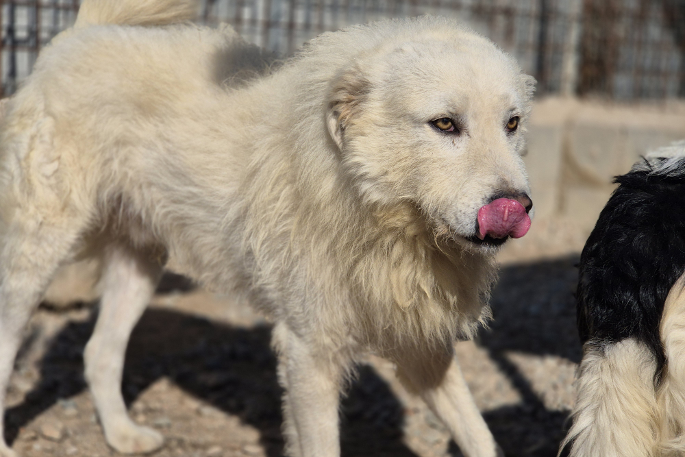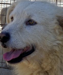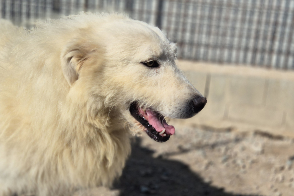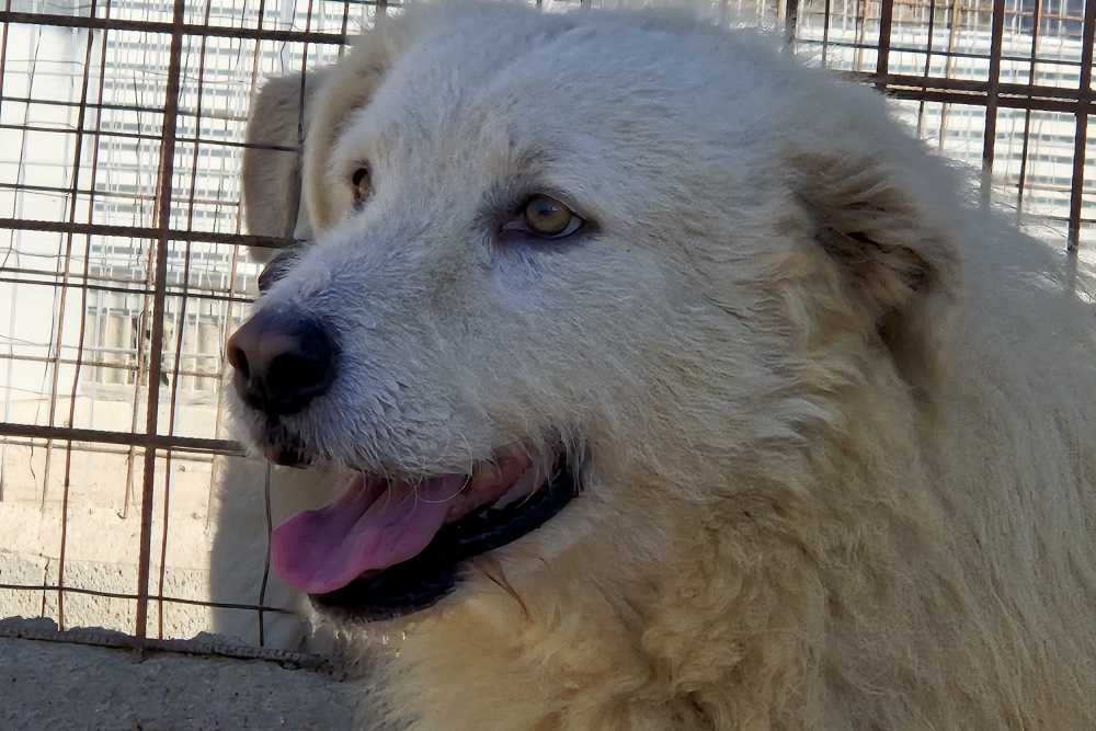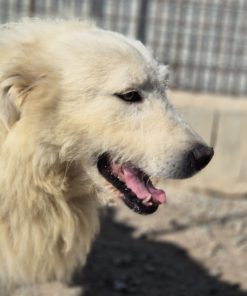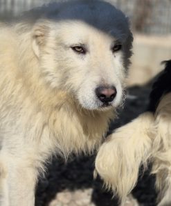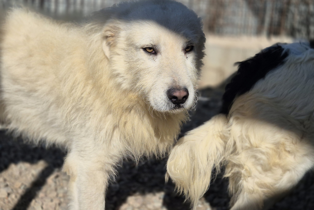 Er hat auffallend hellbraune Augen mit dunkler Umrandung, die ihm einen warmen, ausdrucksstarken Blick verleihen. Sein Fell ist rau, sein Halskragen beeindruckend – ein wenig wie ein kleiner weißer Löwe. Und genau diesen Eindruck vollenden seine Augen: stark, aber sanft; wachsam, aber friedlich.