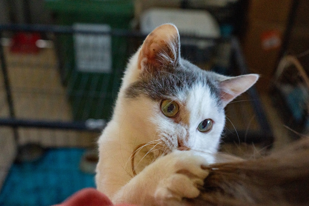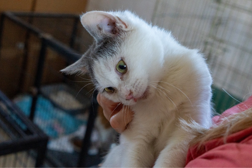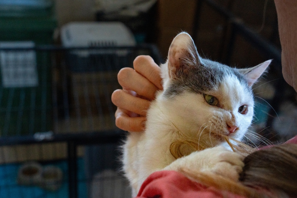 Im Moment leben wir in einem Tierheim, das eigentlich für Hunde ausgelegt ist. Für uns Katzen wurde ein größerer Raum notdürftig mit mehreren Käfigen ausgestattet. Dort teilen wir uns einen kleinen, engen Käfig mit einer winzigen Toilette und ohne Spiel- oder Klettermöglichkeiten. Auch für Streicheleinheiten bleibt den Pflegern leider kaum Zeit, dabei sehnen wir uns so sehr nach Nähe!