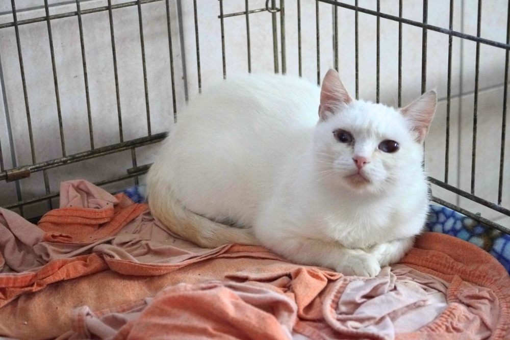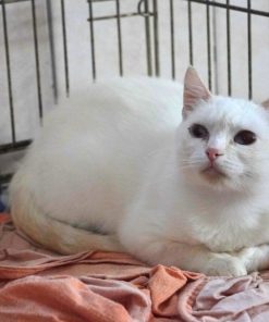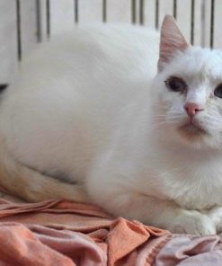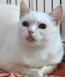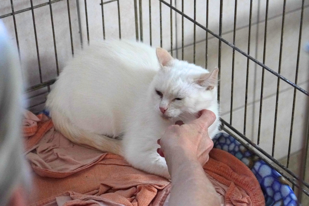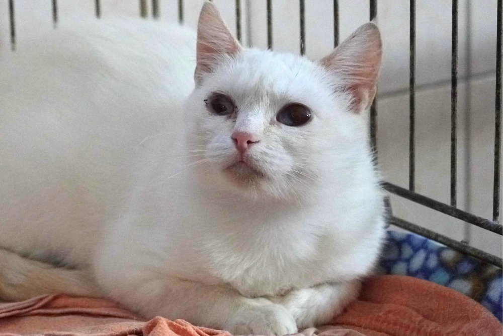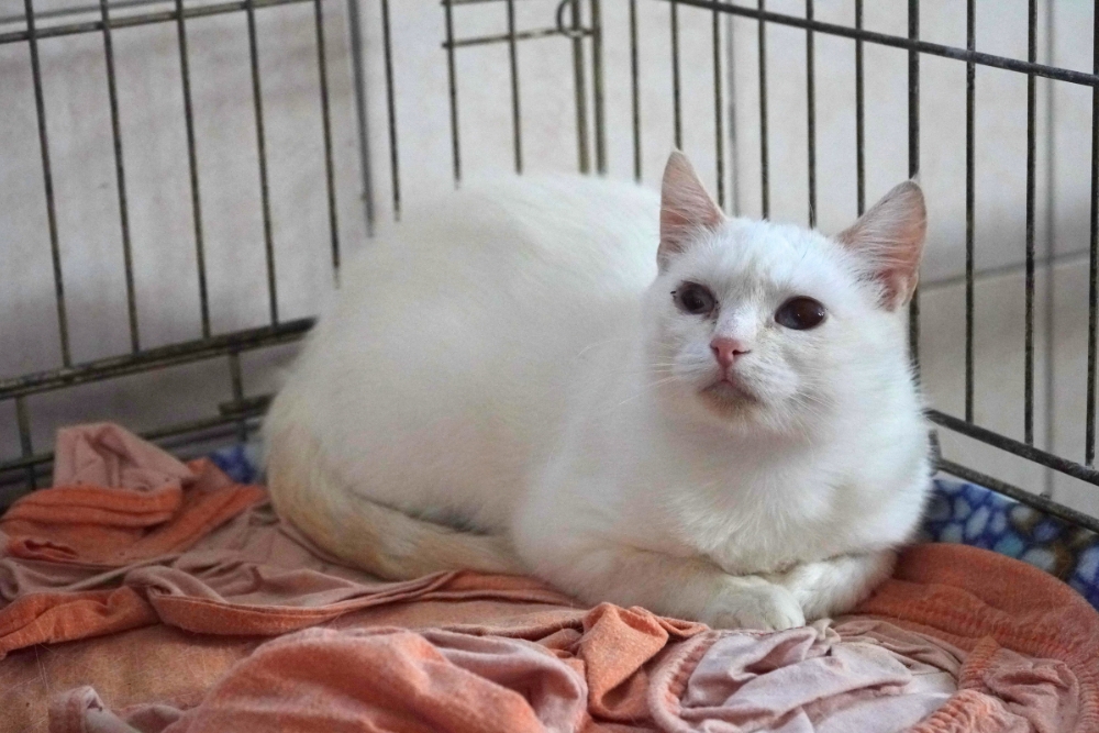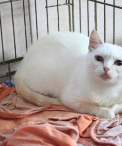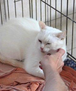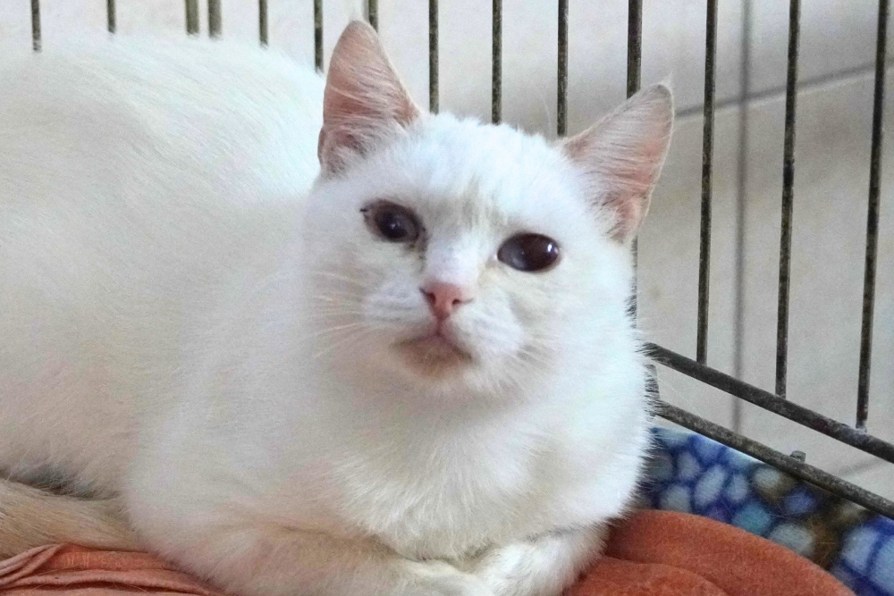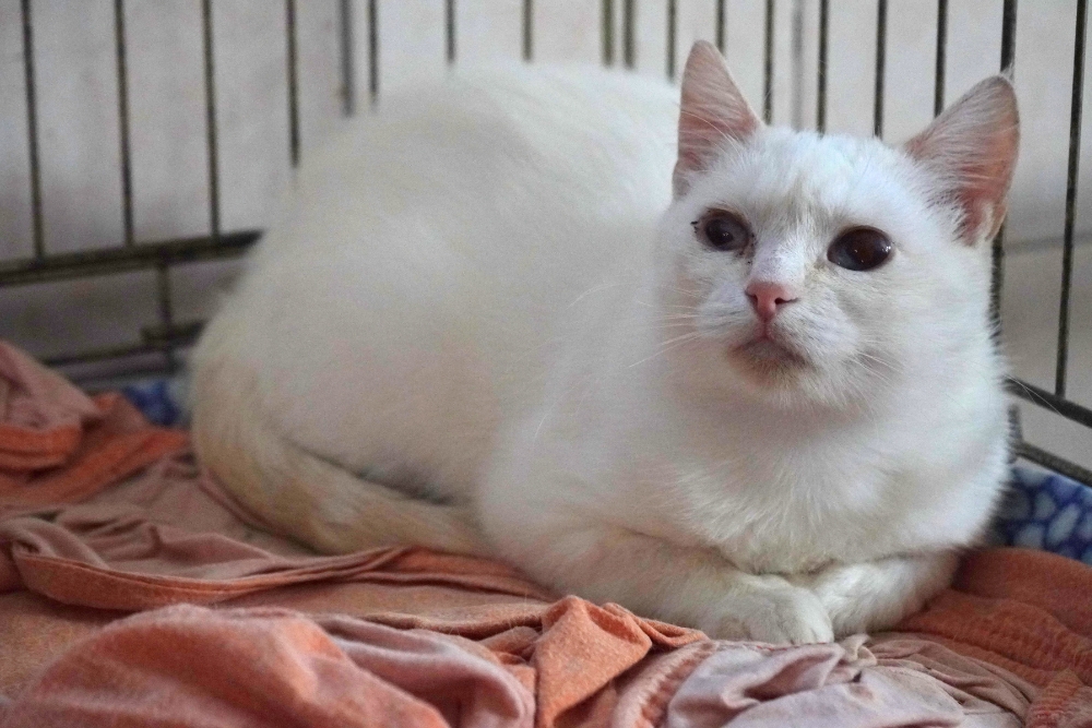 Checki ist eine zarte, schneeweiße Katzendame, deren Schwanz in warmen Rot- und Beigetönen gestreift ist. Eines ihrer Augen ist leider beschädigt, während das andere strahlend blau leuchtet.