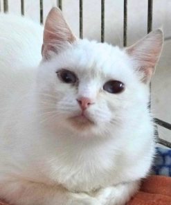 Checki ist eine zarte, schneeweiße Katzendame, deren Schwanz in warmen Rot- und Beigetönen gestreift ist. Eines ihrer Augen ist leider beschädigt, während das andere strahlend blau leuchtet.