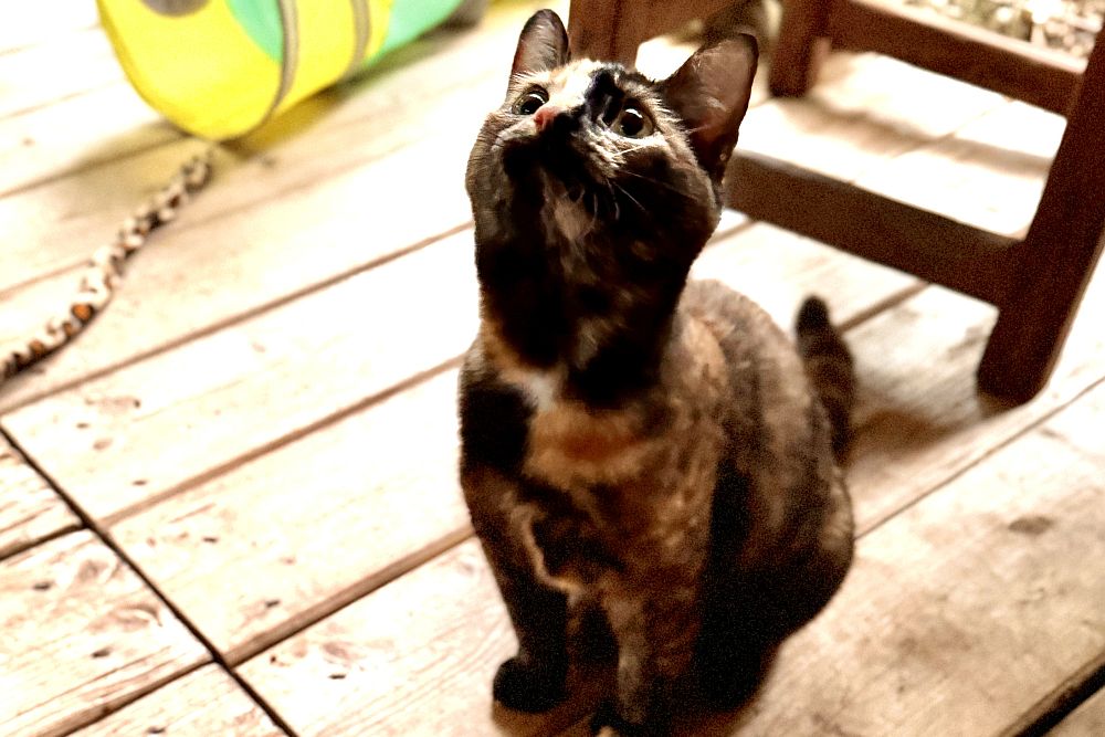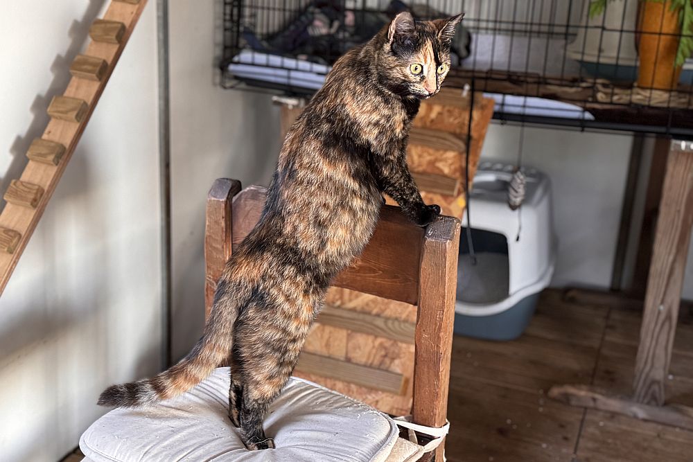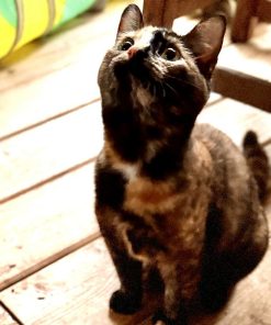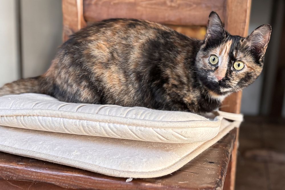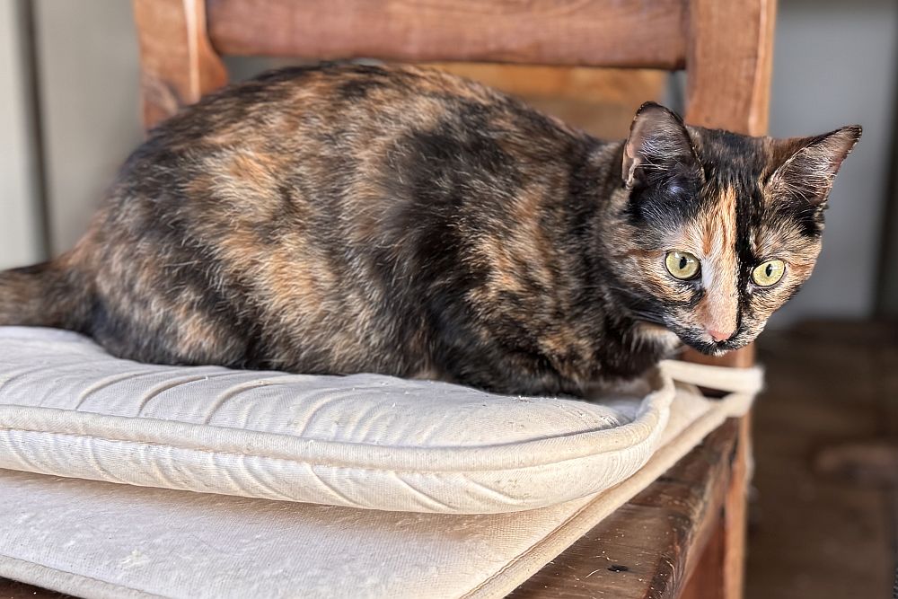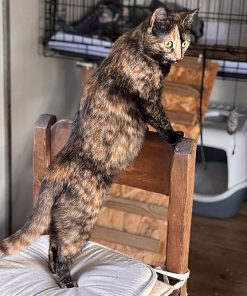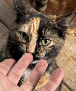 Sie ist eine wunderschöne Schildpattkatze mit einer ganz besonderen, ausdrucksstarken Gesichtszeichnung, die sie unverwechselbar macht.