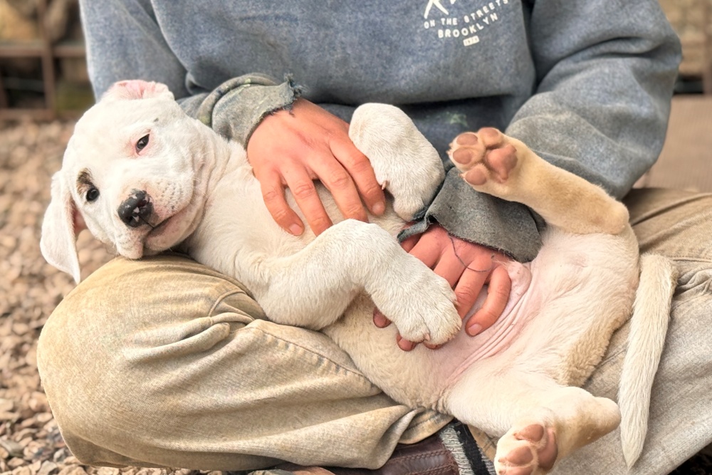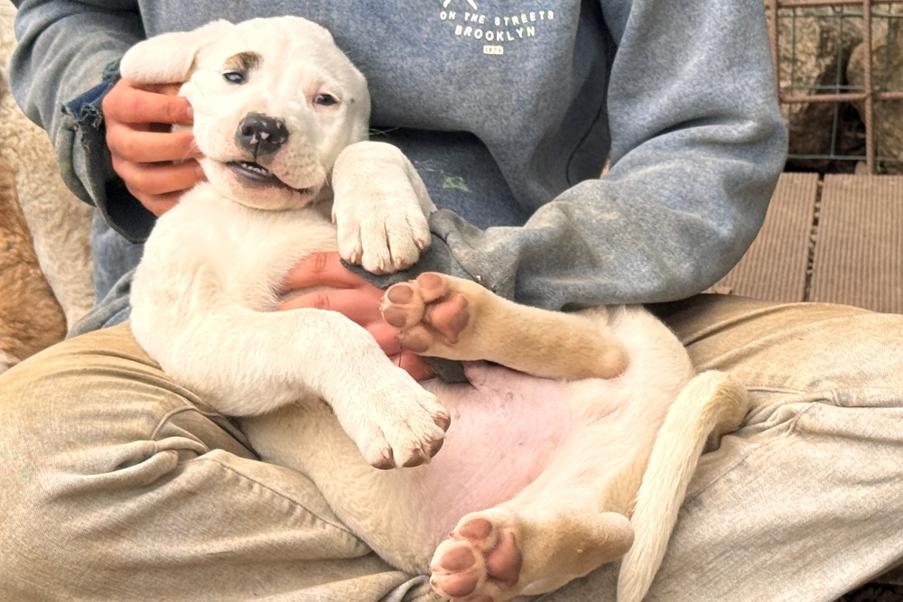 Darius ist ein Welpe, der einem sofort ins Herz fällt. Mit seinem markanten dunklen Fleck am Auge wirkt es fast so, als würde er einen direkt anschauen und sagen: „Siehst du mich?“ – und genau das tut er auch. Darius sucht aktiv den Blickkontakt zu seinem Menschen, reagiert sehr fein auf Mimik und Körpersprache und baut darüber eine besonders enge Verbindung auf.