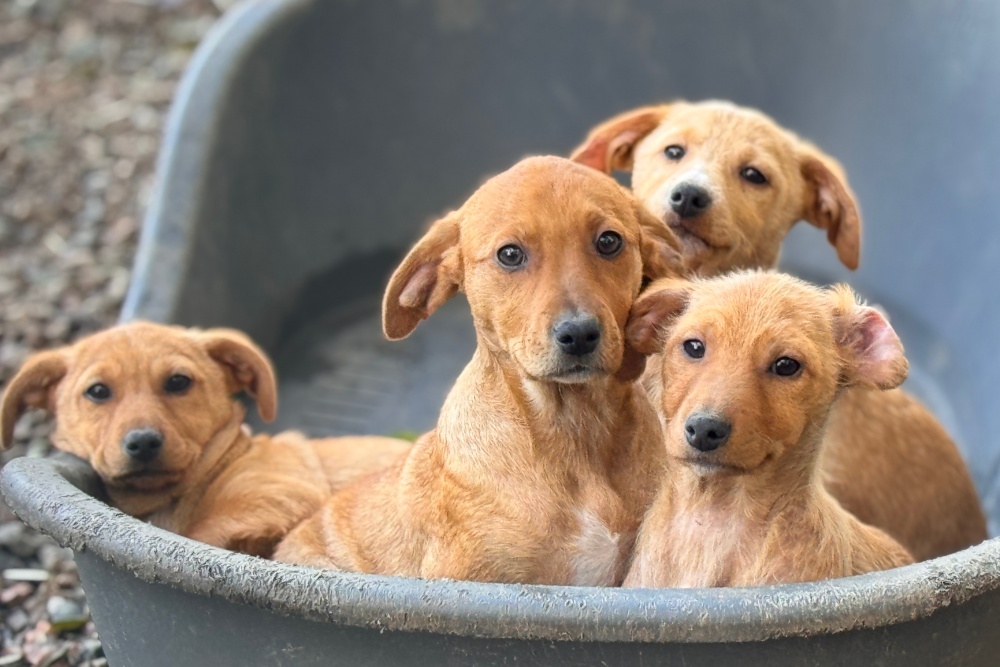 Sechs Welpen wurden an einem alten Steinbruch entdeckt – abgemagert, hungrig und übersät mit Flöhen. Ihre Haut war von kahlen Stellen gezeichnet, die kleinen Bäuchlein vom Wurmbefall aufgebläht. Eine Anwohnerin bemerkte sie, fütterte sie an und konnte sie schließlich sichern. Was sie in ihrem jungen Leben bereits erlebt haben, bleibt ungewiss – umso größer ist die Dankbarkeit, dass sie nun in Sicherheit sind und wir uns um sie kümmern dürfen.