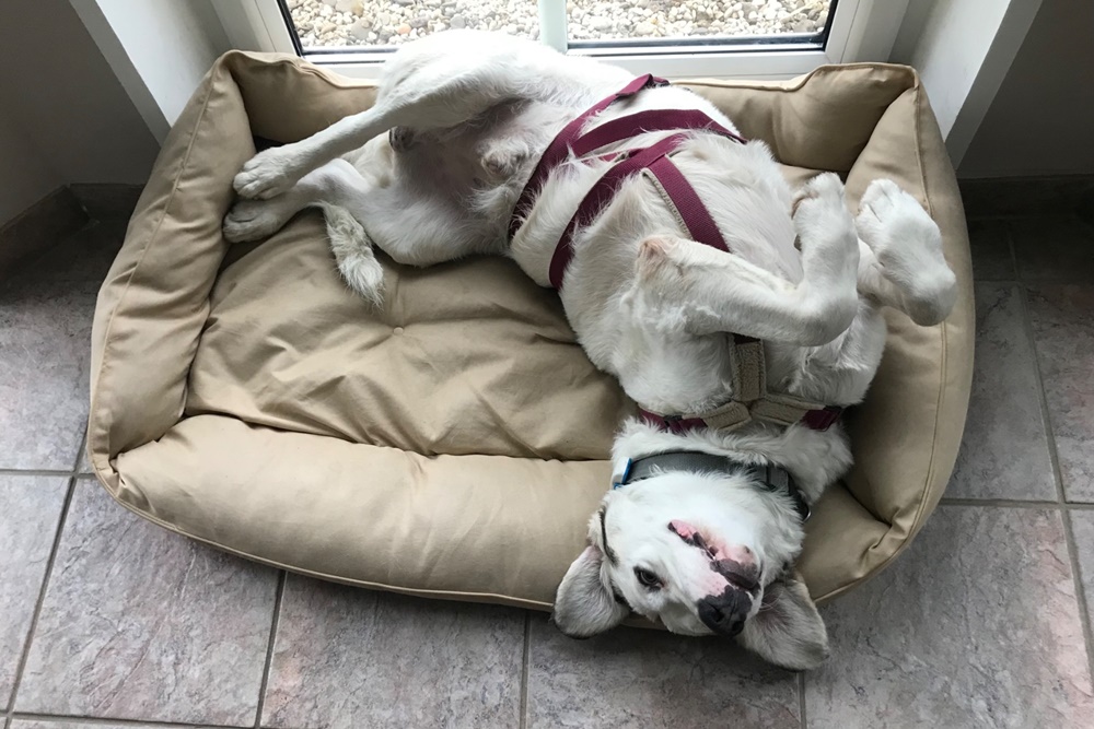 Frank bleibt ohne Probleme mehrere Stunden mit der Ersthündin allein, ganz allein zu bleiben übt er gerade. Frank steigt noch nicht gerne ins Auto ein, aber das Fahren macht ihm keine Probleme. Die Pflegefamilie hat nun eine Box für das Auto besorgt, die Frank im Haus schon sehr gut annimmt und hoffentlich bald auch gerne im Auto annimmt.