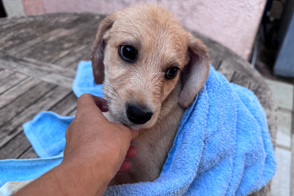 Gada hätte beinahe viel zu früh ihr Leben verloren. An einem Montagmorgen fütterte ein tierlieber Sarde die Katzen einer Kolonie an einer Müllsammelstelle, wie er es regelmäßig tut. Dabei hörte er ein leises Winseln. Den ganzen Tag ließ ihn dieses Geräusch nicht los. Am Abend ging er noch einmal dorthin zurück und sah Gada: tief verborgen zwischen rostigen Metallteilen, kaputtem Plastik und altem Hausmüll. Er rief uns an und wir starteten eine Rettungsaktion. Es gelang uns, Gada aus dem Müll zu befreien – ein zitterndes Bündel Leben, voller Flöhe und Zecken, mit einem vor Wurmbefall aufgeblähten Bauch. Trotz allem hat sie glücklicherweise überlebt.