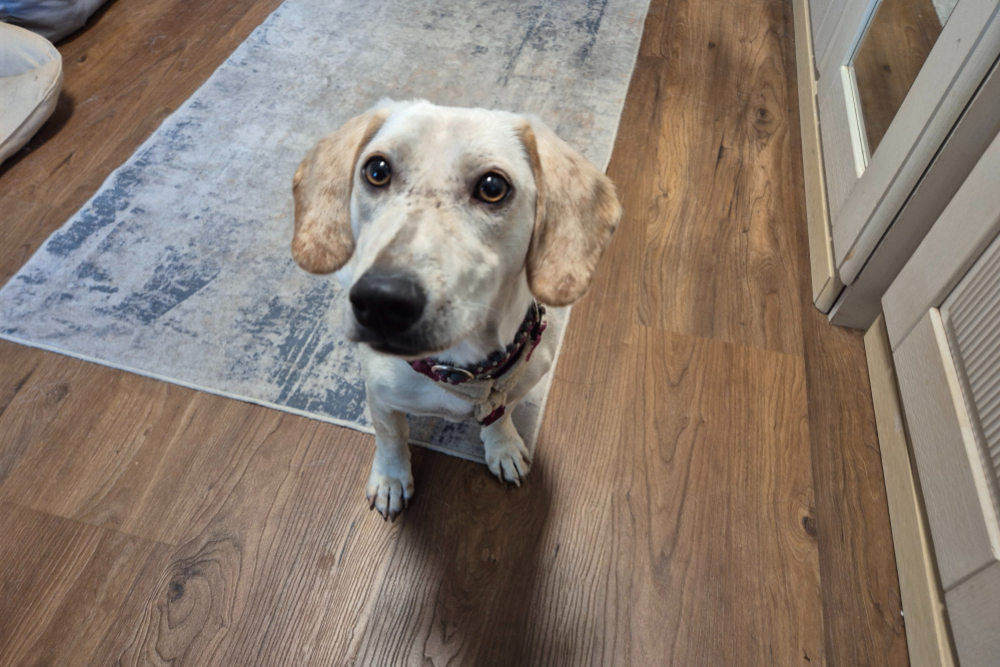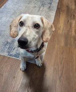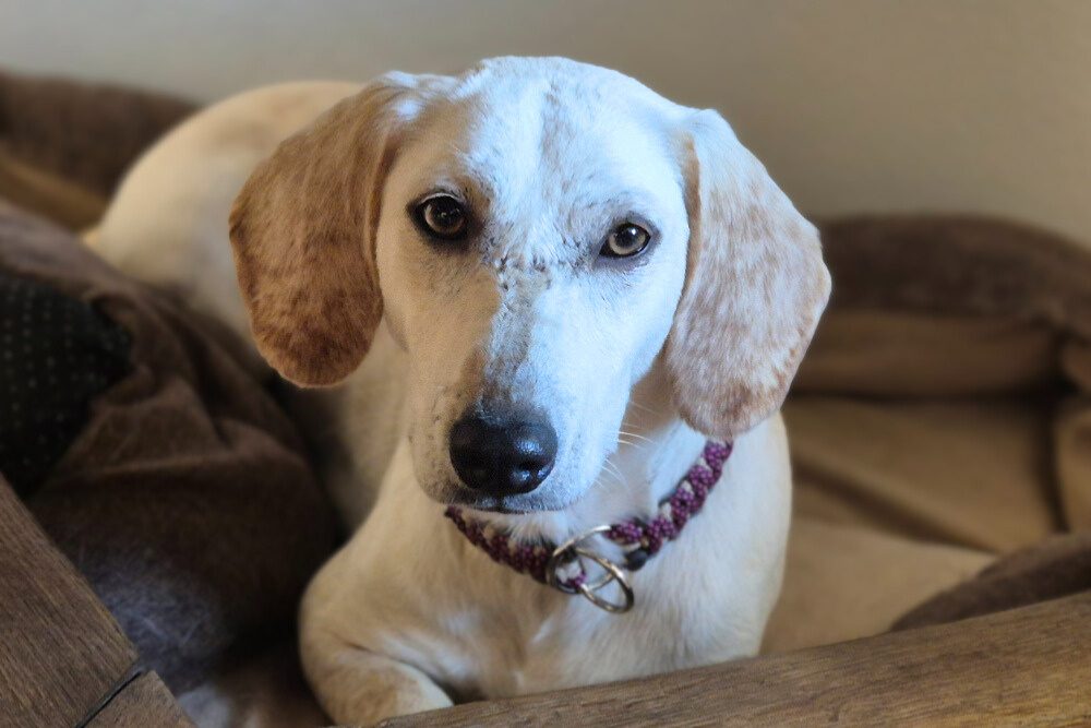 - Ohren: Hoch angesetzt und hängend (V-förmig)