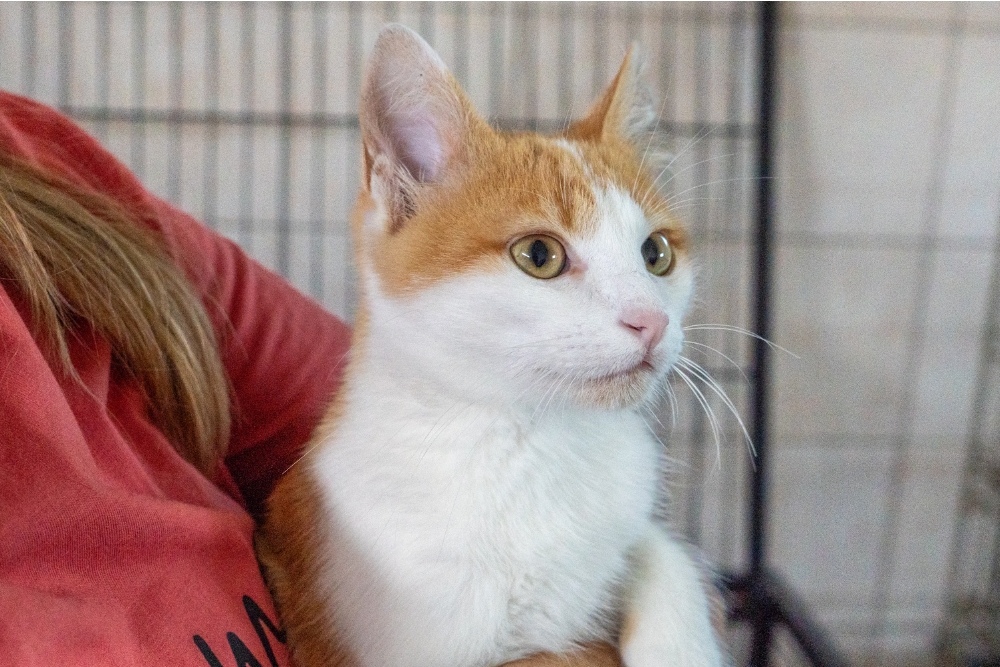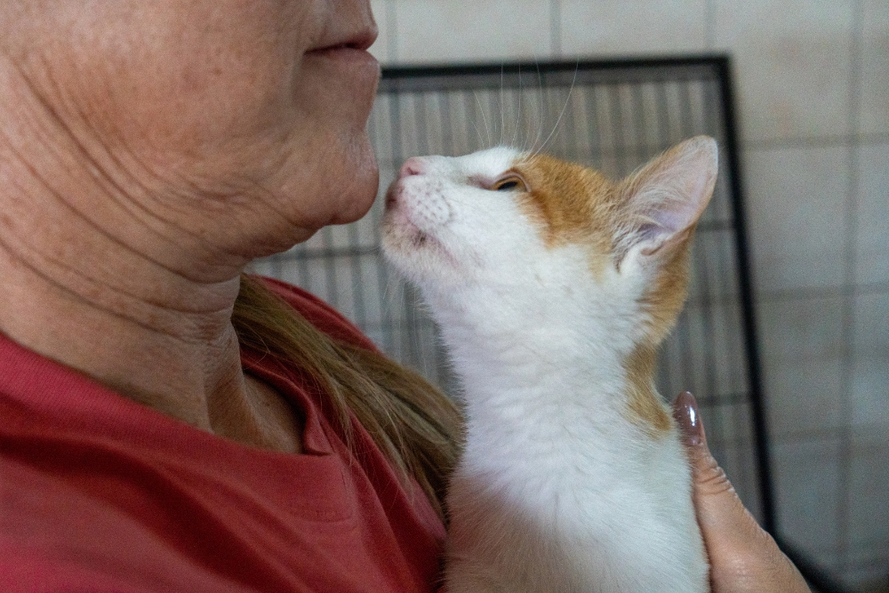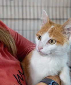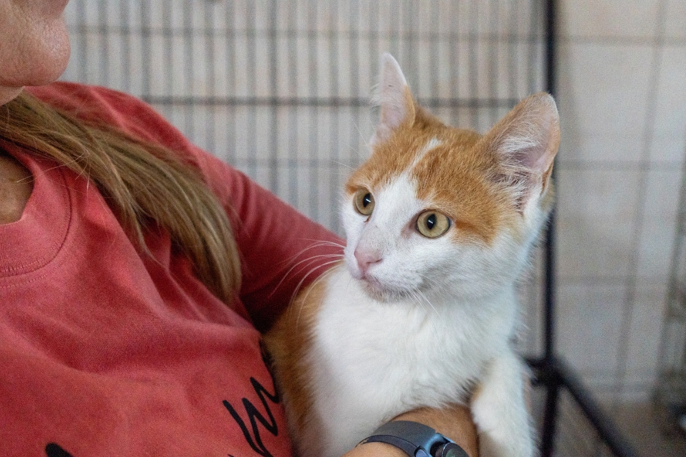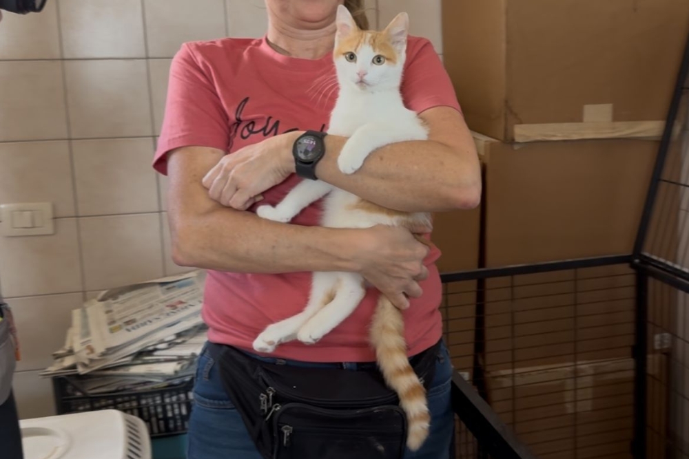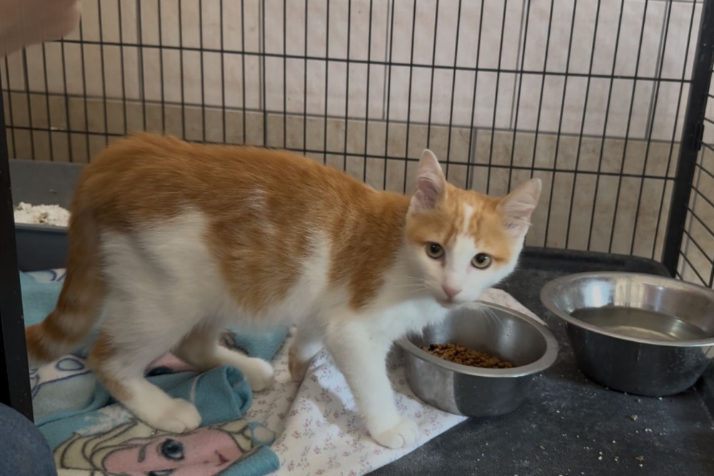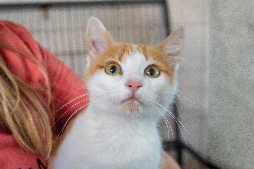 Ich bin ein aufgeweckter und sehr menschenbezogener Kater. Als ich im Oktober besucht wurde, habe ich laut nach Aufmerksamkeit gerufen. Als ich dann die Aufmerksamkeit hatte, habe ich mich auch ganz lieb auf den Arm nehmen lassen und geduldig die Fotosession über mich ergehen lassen. Zurück im Käfig versuchte ich, durch das geöffnete Gitter spazieren, während jemand gerade ein Video aufnahm. Doch so einfach wollten sie mich nicht den Raum erkunden lassen. Also habe ich ständig so getan, als würde ich fressen wollen, nur um dann wieder einen Fluchtversuch zu starten – leider ohne Erfolg.