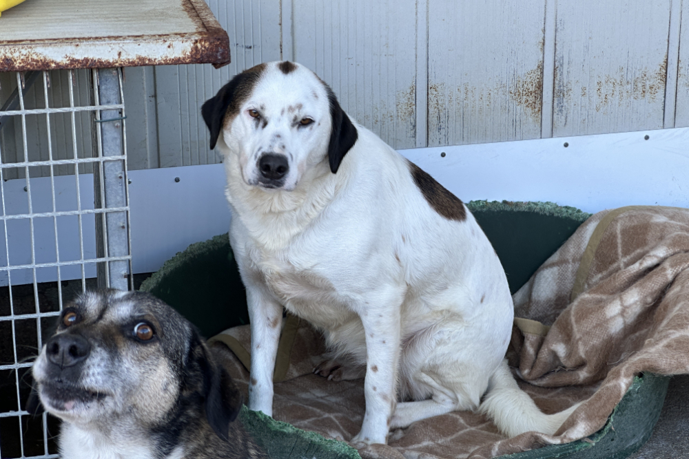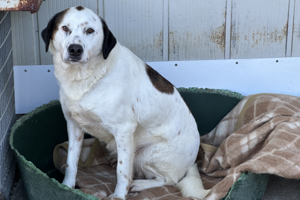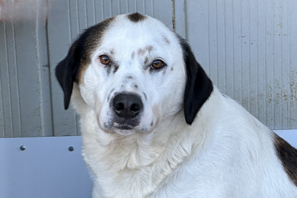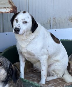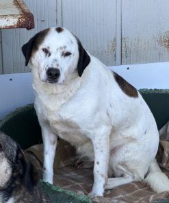 Peggy ist eine stattliche, selbstbewusste Hündin mit etwa 60 cm Schulterhöhe. Ihr weißes Fell mit braunen Abzeichen erinnert stark an ihre Schwester Pixar. Aktuell ist Peggy deutlich übergewichtig – ein bekanntes Problem in der L.I.D.A., wo bewusst reichlich gefüttert wird, um Futterneid und Konflikte in großen Gruppen zu vermeiden. Verständlich, aber auf Dauer nicht gesund.