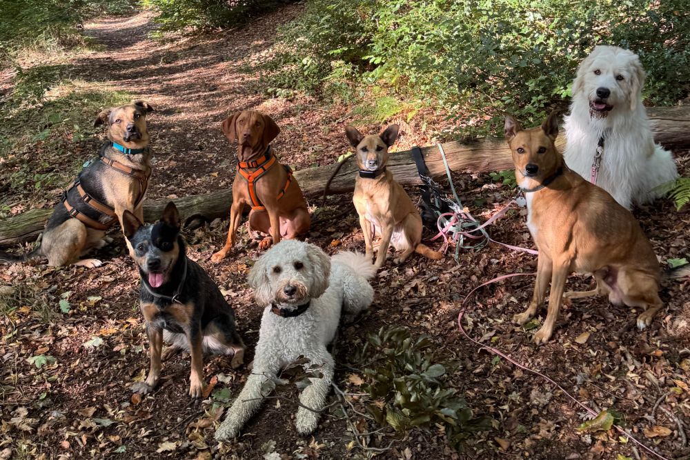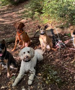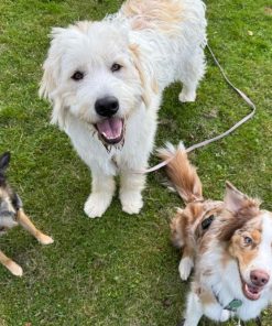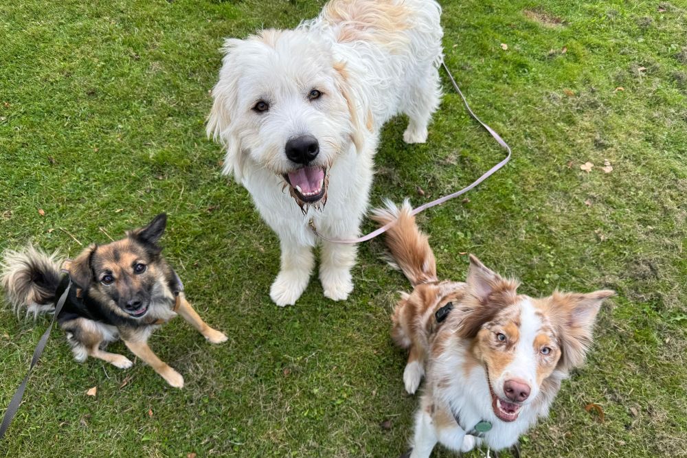 Mit anderen Hunden bin ich sehr verträglich, spiele gern, schirme aber meine Menschen manchmal vor fremden Hunden ab. Dann zeige ich das mit T-Stellung oder leichtem Knurren – bekomme ich die richtige Anleitung, höre ich sofort auf. Jagdtrieb zeige ich bisher keinen.