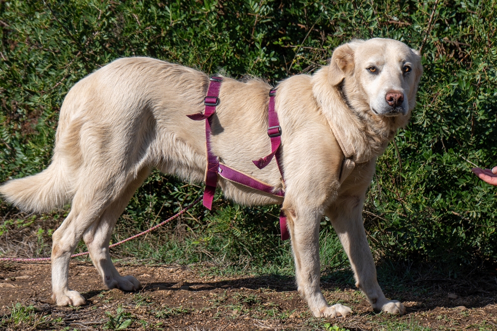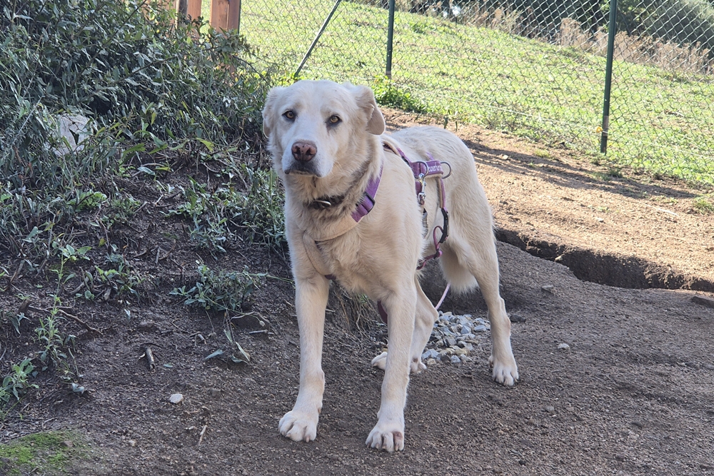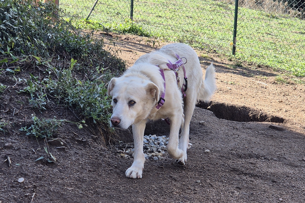 Mittlerweile ist Toto kastriert und meistert die Routinen in der Hundestation immer besser. Er nimmt regelmäßig an Spaziergängen teil, kennt Leine und Geschirr und lässt sich ruhig führen. In neuen Situationen ist er zwar noch vorsichtig, aber man spürt, dass seine Neugier stärker wird als die Angst. Wenn er sich sicher fühlt, zeigt er seine sanfte, fröhliche Seite – dann läuft er mit erhobenem Schwanz, flitzt durchs Gehege und genießt seine Freiheit.