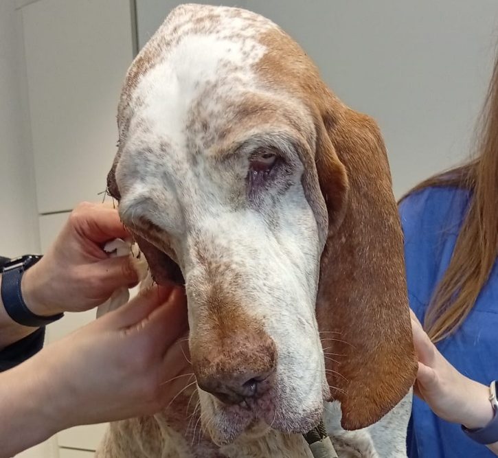 Bei ihm wurde ein Polyp im Gehörgang festgestellt. Dieser verursacht eine chronische, eitrige Entzündung (Otitis externa), die ihm starke Schmerzen bereitet. Die einzige dauerhafte Lösung ist eine aufwendige Operation: eine sogenannte Total Ear Canal Ablation (TECA) – dabei wird der komplette Gehörgang entfernt und die Paukenhöhle geöffnet und gesäubert (Bulla-Osteotomie).
