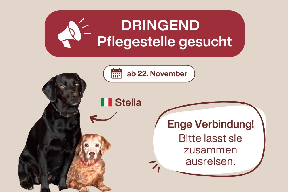 Benson hat bereits eine Familie gefunden und darf Ende November ausreisen. Doch bei einem Tierarztbesuch wurde deutlich, wie tief ihre Verbindung ist: Benson suchte verzweifelt nach Stella, war sehr aufgeregt, und Stella verweigerte aus Kummer ihr Futter – völlig untypisch für unsere sonst verfressene Labbi-Dame.